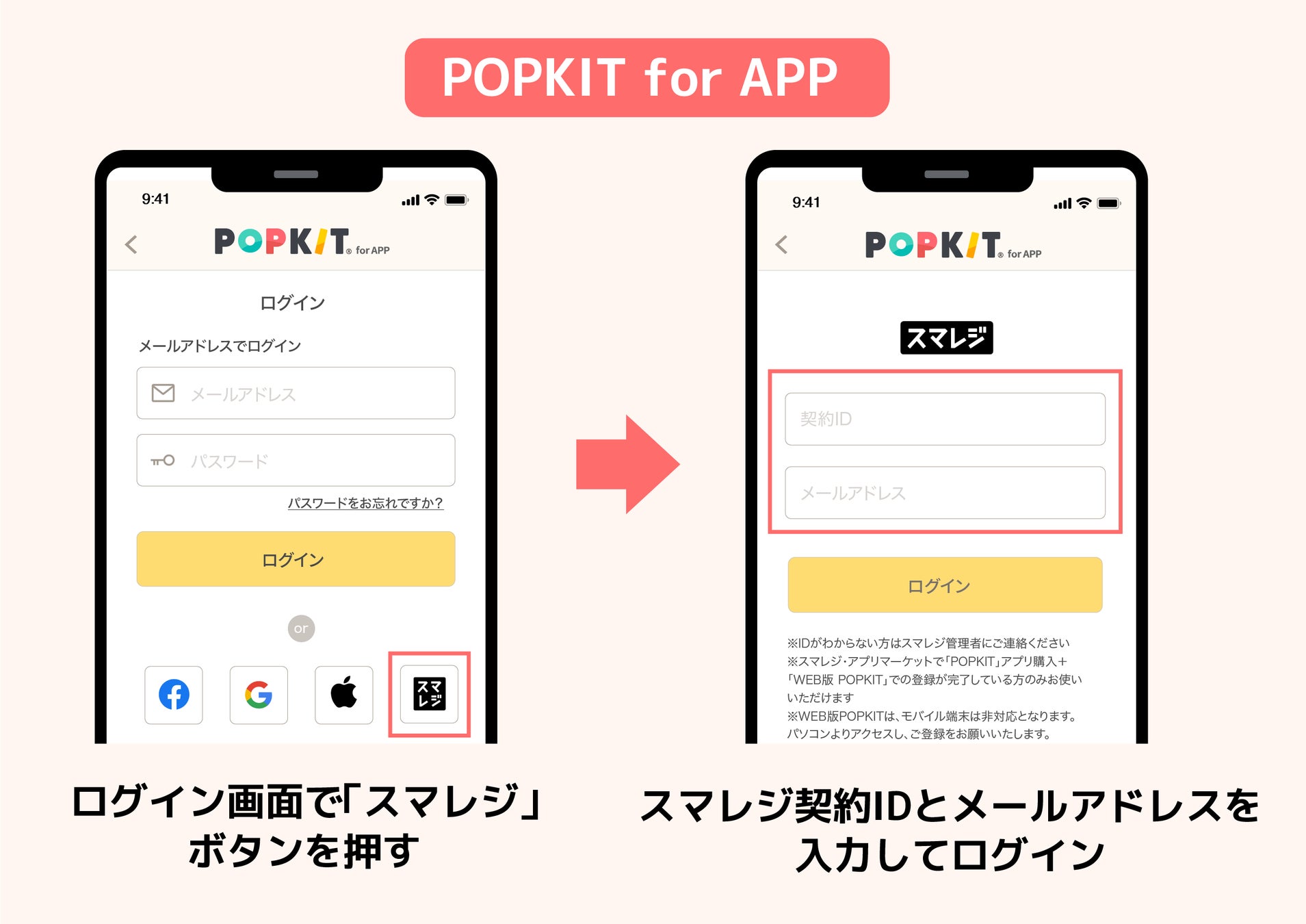 ③WEB版POPKITでの登録が完了すると、iPhone/iPad(アプリ版)でもご利用できます。その際、App Storeから「POPKIT for APP」をダウンロードし、ログイン時にスマレジの契約IDとスタッフメールアドレス入力が必要です。
