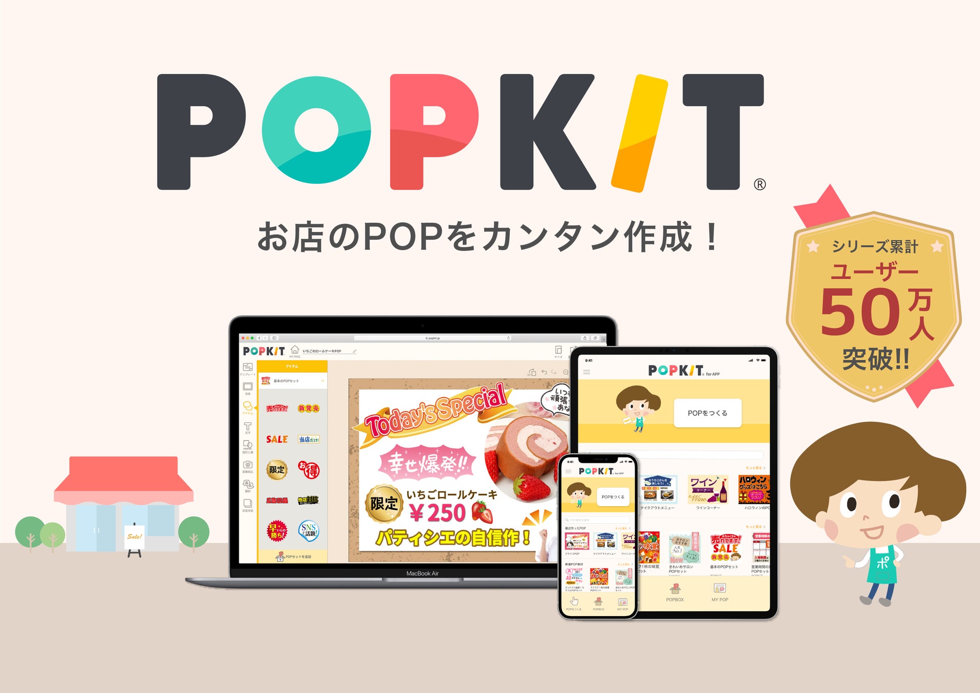 「POPKIT」は、シリーズ累計50万ユーザー突破の(※)POPデザイン作成ツール。あらかじめ入っている素材を組み合わせるだけで、誰でも簡単にPOP作成ができます。パソコン(WEB)・iPhone/iPad(アプリ)に対応。POP作成の他、チラシ・SNS・HP・動画サムネイル等、顧客に向けてビジュアル的な告知を行うあらゆるシーンで活用できます。
