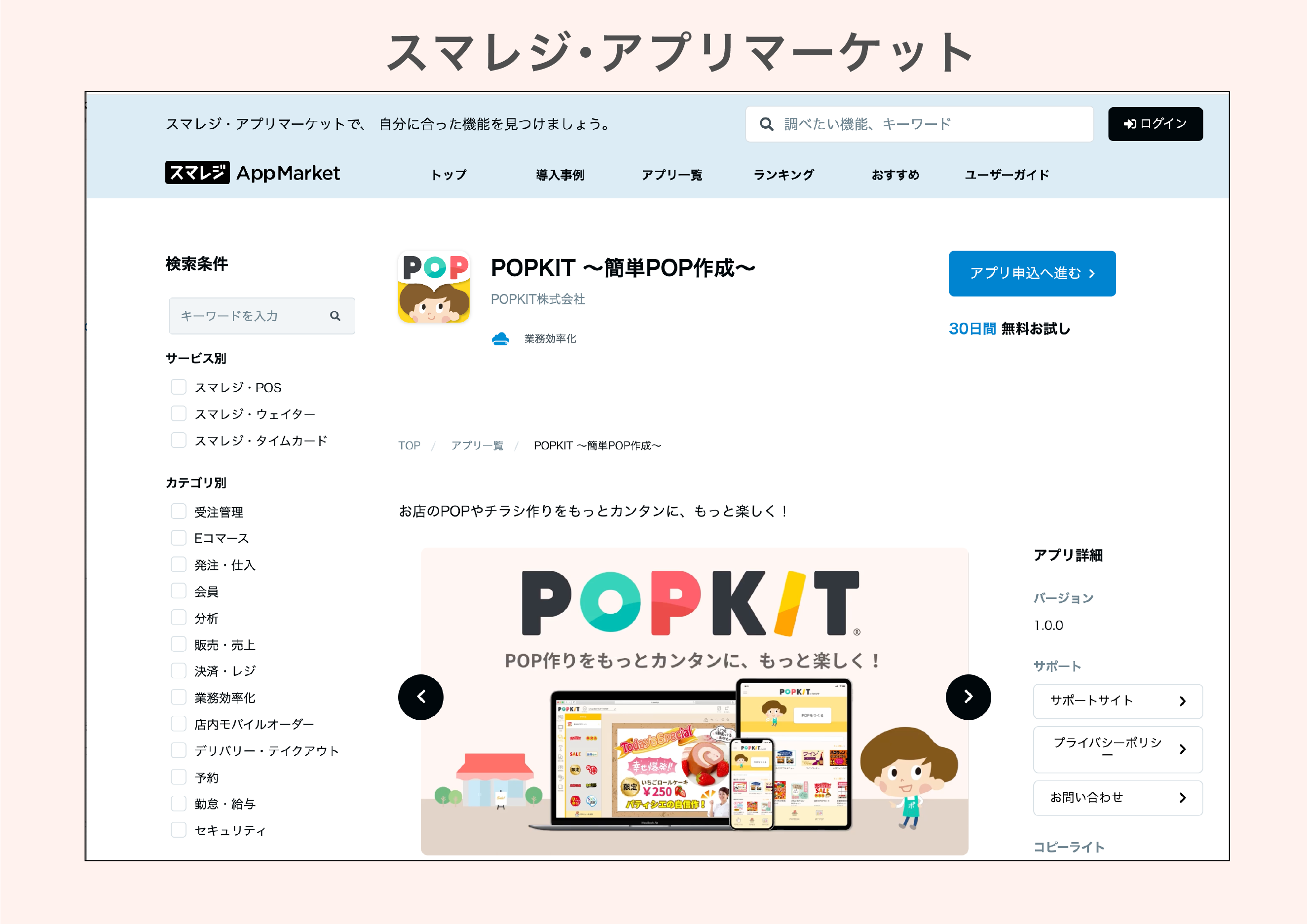 この度、POPKITが「スマレジ・アプリマーケット」に参加しました。 スマレジ利用ユーザーは、スマレジ・アプリマーケットでPOPKITアプリの申込を行うことで、ログイン連携ができるようになり、POPKITを利用することができます。