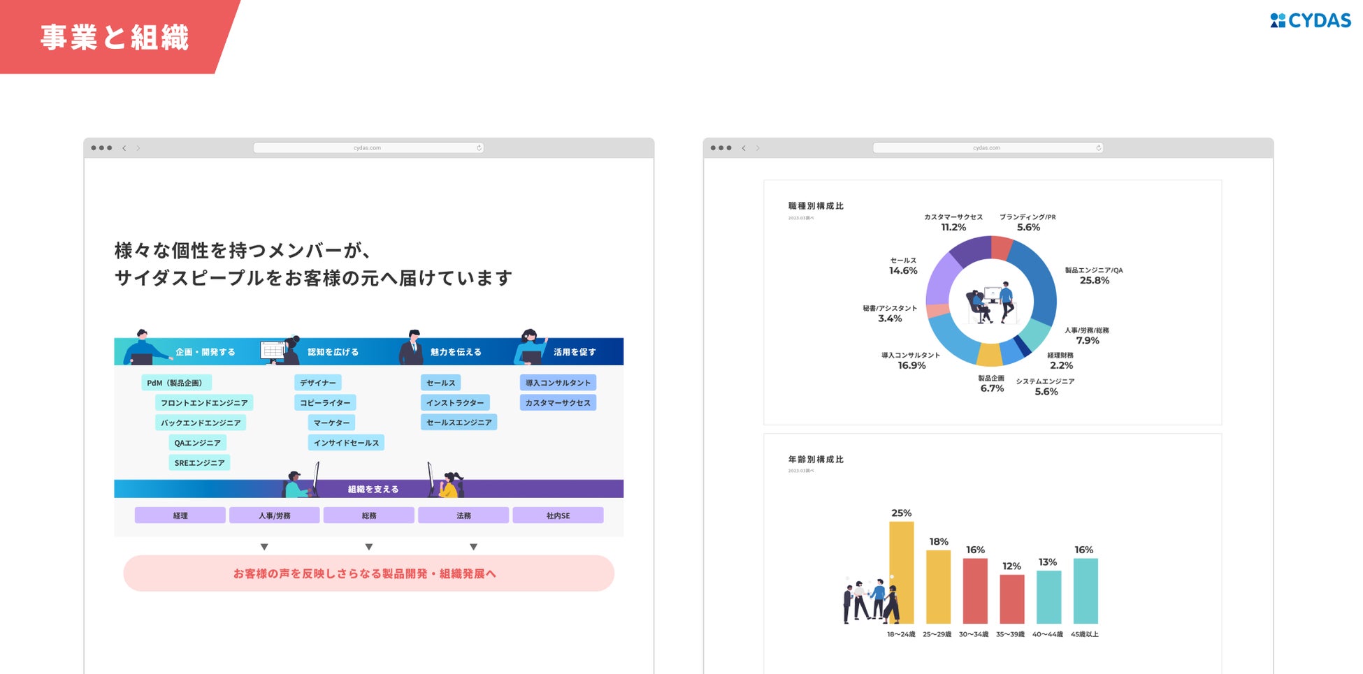 サイダスに入社する方のバックグラウンドは様々。人事システムやIT業界、SaaSビジネスにまだ馴染みのない求職者の方にも伝わるよう、インフォグラフィックやイラストを用いて、サイダスの提供サービスと組織体制を紹介しています。