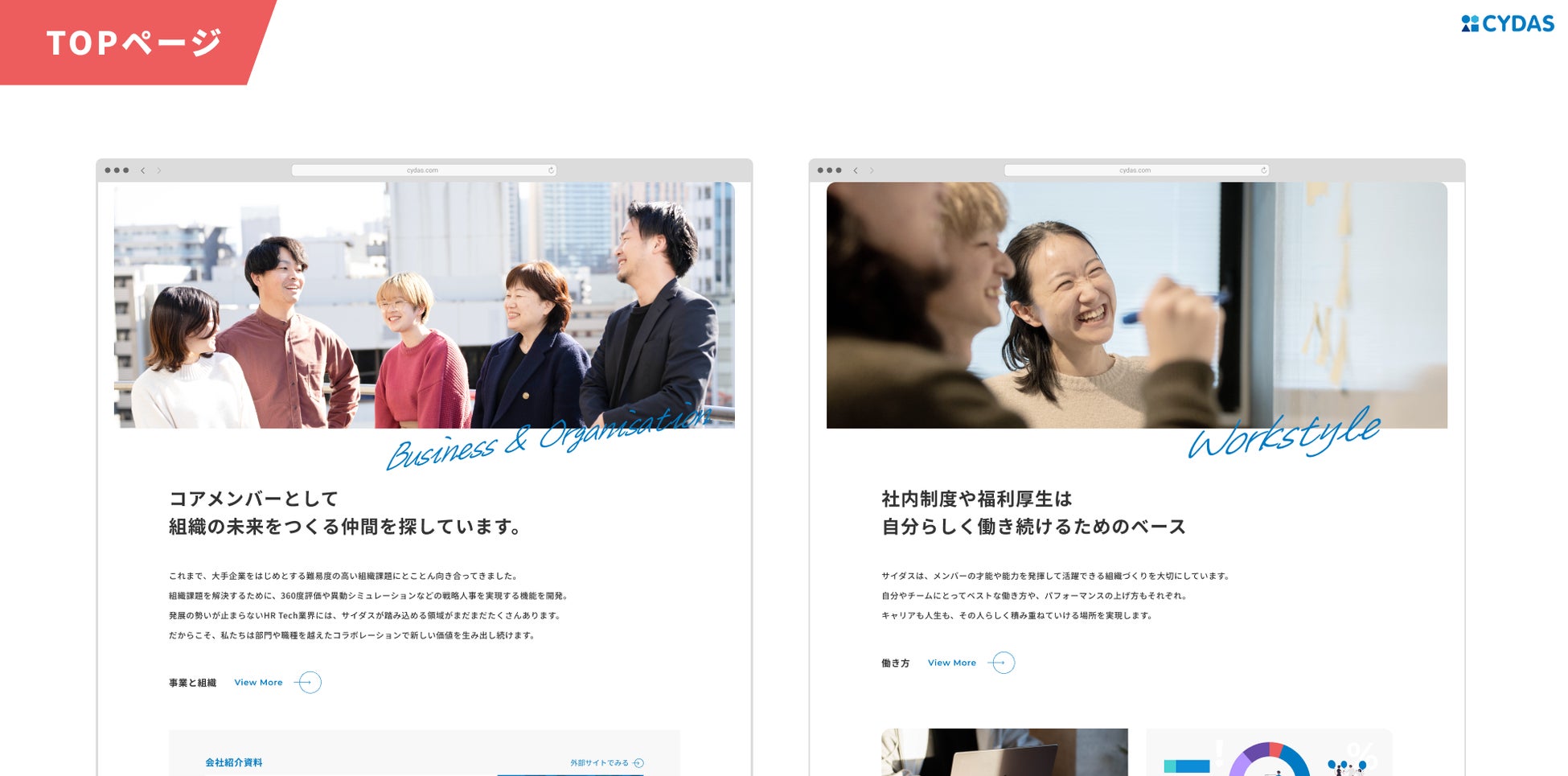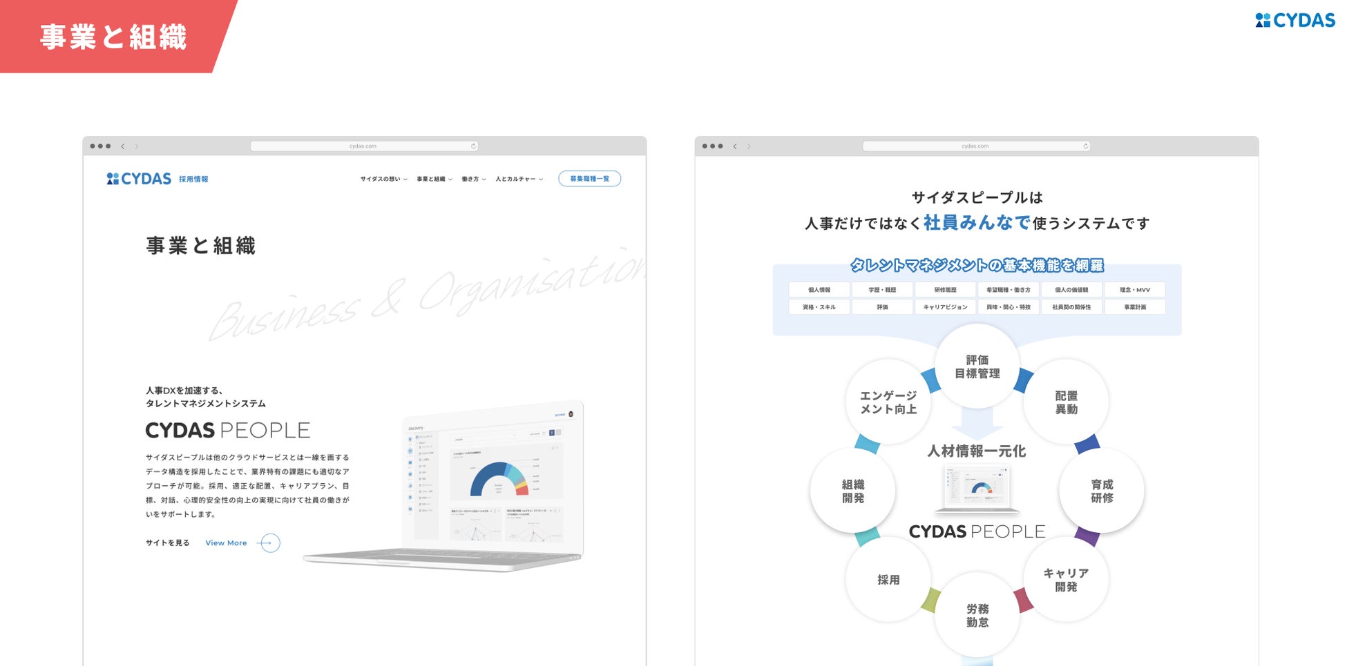 「働きがい」をつくる人事DX「CYDAS PEOPLE」を提供するサイダスは、タレントマネジメントシステム業界のパイオニアとして、様々な人事課題・組織課題と向き合ってきました。社員数が100名を超え拡大フェーズにある今、各職種において採用を強化すべく本リニューアルを実施。より社風や働く環境、人々の魅力が伝わるサイトへと生まれ変わりました。