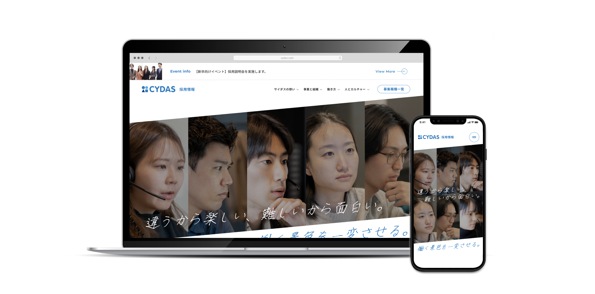 「働きがい」をつくる人事DX「CYDAS PEOPLE」を提供するサイダスは、タレントマネジメントシステム業界のパイオニアとして、様々な人事課題・組織課題と向き合ってきました。社員数が100名を超え拡大フェーズにある今、各職種において採用を強化すべく本リニューアルを実施。より社風や働く環境、人々の魅力が伝わるサイトへと生まれ変わりました。