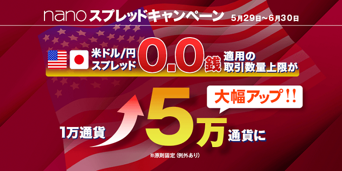 パートナーズFXnano「米ドル/円」において、24時間スプレッド0.0銭※原則固定(例外あり)でお取引いただける1回あたりの最大発注数量を1万通貨から5万通貨へ拡大いたします。