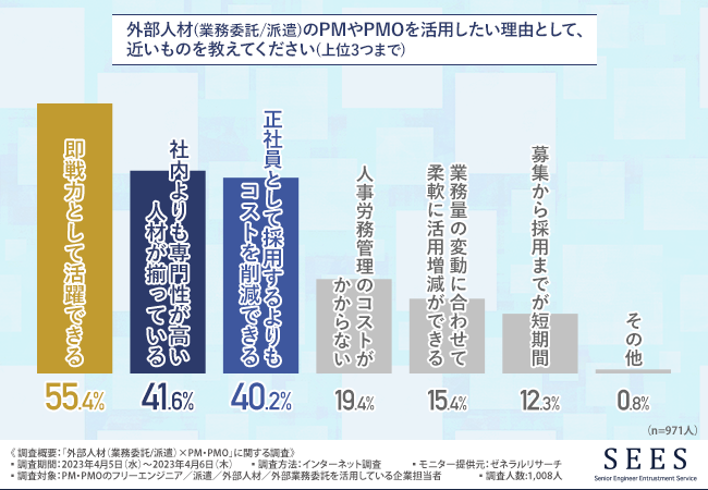 ・外部人材(業務委託/派遣)のPMやPMOを活用したい理由として『即戦力として活躍できる(55.4%)』『社内よりも専門性が高い人材が揃っている(41.6%)』『正社員として採用するよりもコストを削減できる(40.2%)』
