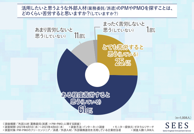 外部人材のPMやPMOを探すのに苦労すると思うと答えた企業担当者が、程度の違いはあっても8割以上いることがわかりました。