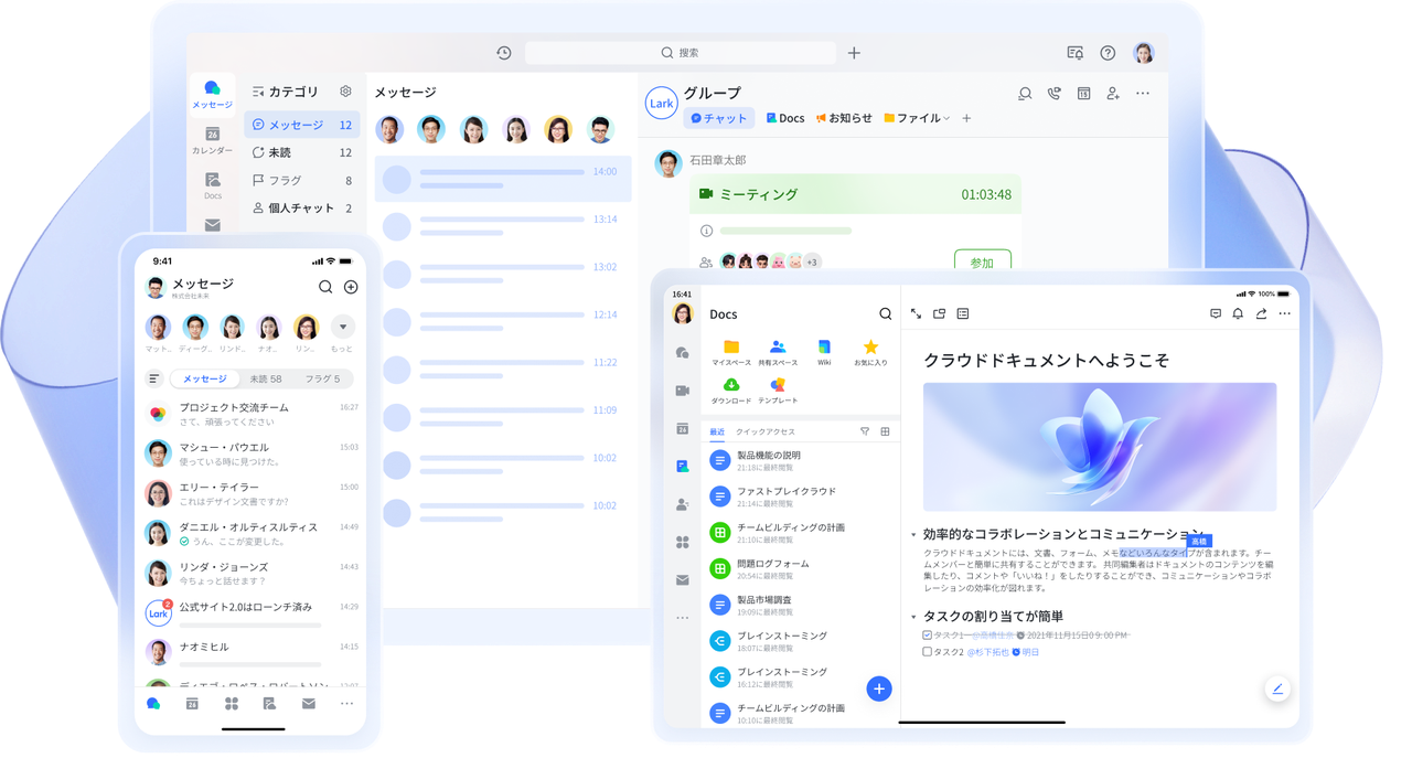 Larkは、あらゆるニーズに対応する1つのスイートで、チームの共同作業を可能にする次世代コラボレーションツールを特徴としています。チャットを起点に、メール・カレンダー・ビデオ会議・ドキュメント・ワークフロー・バックオフィス機能など、多数の頻用ツールを1つのプラットフォームに統合することで、より効果的なコラボレーションが実現できます。すべての機能が1つのアプリに統合されており、Mac、Windows、iOS、Androidで利用可能です。
