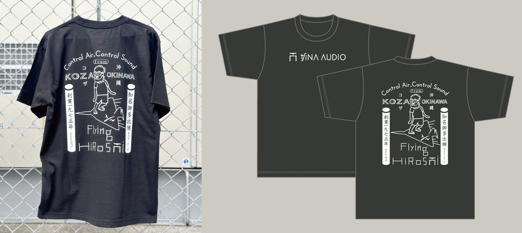 知名オーディオのオリジナルグッズ第一弾は、開発者「知名 宏師(ちな ひろし)」が、発想の源であり趣味でもあったラジコン飛行機に乗ったキャラクター『Flying HIROSHI』を描いたTシャツ、ステッカーです。