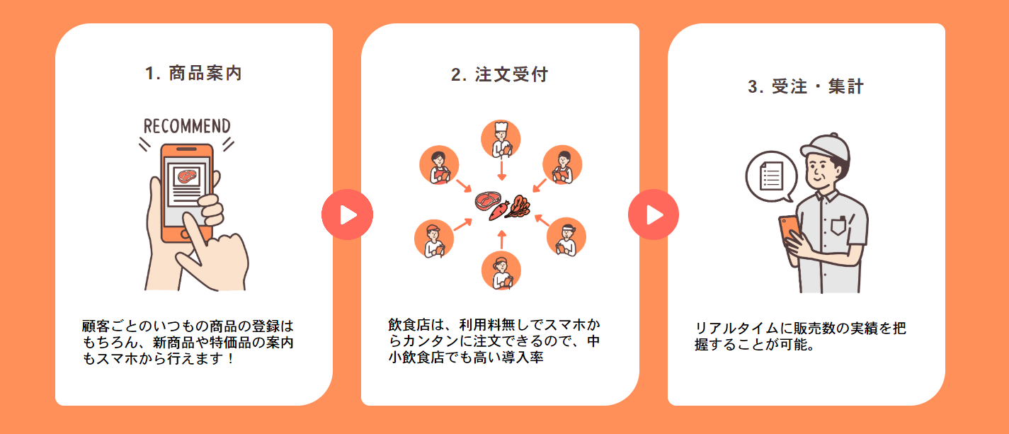 「TANOMU」は飲食店や理美容などの店舗と食品卸売業者間の受発注をPCやスマートフォンで管理可能な、非接触営業・受発注管理システムです。