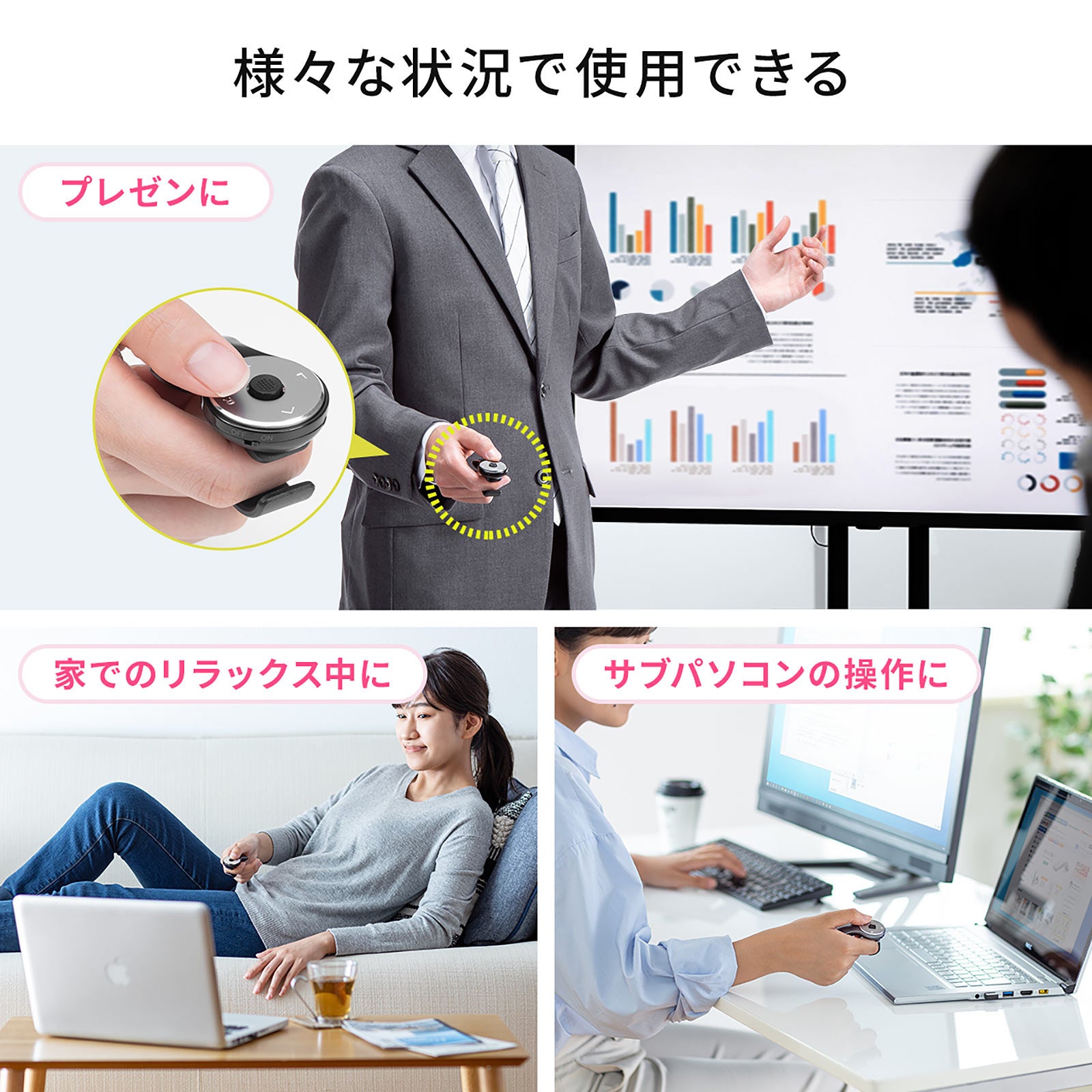 本製品は、指輪のように指に装着して使うリングマウスです。プレゼンソフトの操作やリラックスした姿勢でのパソコン操作に適しています。