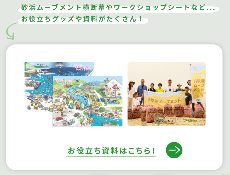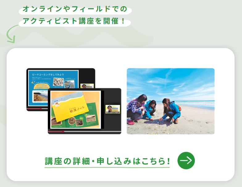 1人でも多くの方に海や砂浜のことを知ってもらうため、魅力や課題を伝え広げていってくれる人を「砂浜アクティビスト」と呼び、活動を応援します。「砂浜ノート」をはじめ「砂浜クエスト」「海を学ぶワークショップ」などの資料やプログラムの使い方を紹介し、誰でも気軽に自然観察会やビーチクリーンを開催できるお手伝いをします。詳細は特設サイトで順次公開します。