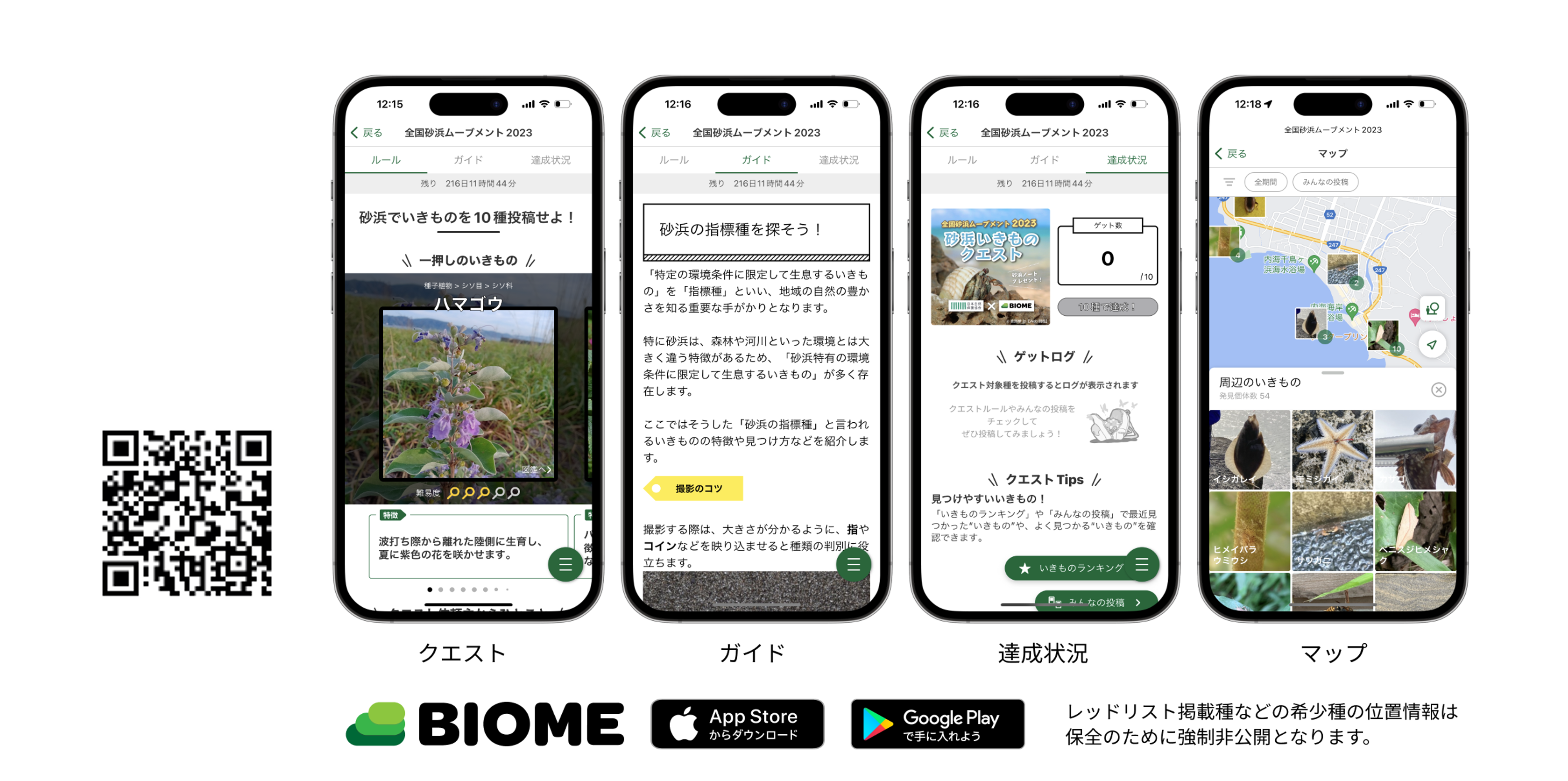 海と陸の間にある砂浜には、たくさんの生きものの世界が広がっています。砂浜で貝や植物などを見つけたら、写真を撮って、生きものアプリ「BIOME(バイオーム)」に投稿してください。名前がわからなくても、AI が名前を推測してくれるので、誰でも気軽にご参加いただけます。投稿された生きものデータは、NACS-J が海や砂浜の自然環境を保全するために活用します。今年は「砂浜のことを知るてがかりになる生きもの10種」をはじめ 、60,000 件の投稿を目指しています。