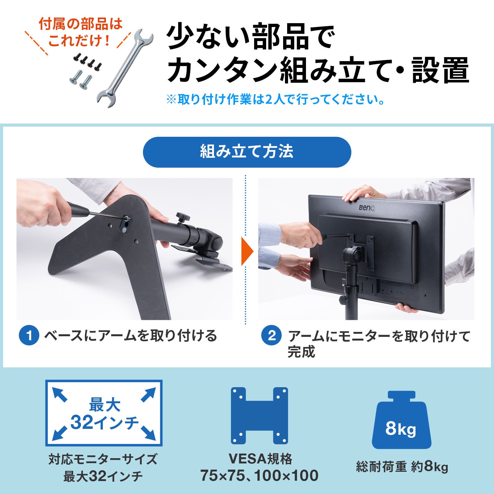 部品が少なく、スタンドの組み立てからモニターの取り付けまで手間がかからず、簡単に設置できます。