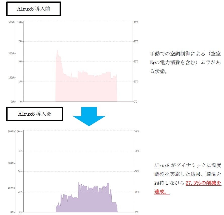 AIrux8導入前には把握することができなかったAIrux8の運用設定の効率化、オフィス環境における空調設備の適正化及びNodeセンサーデータに基づいた自動制御により、上記結果に繋がったと考えております。