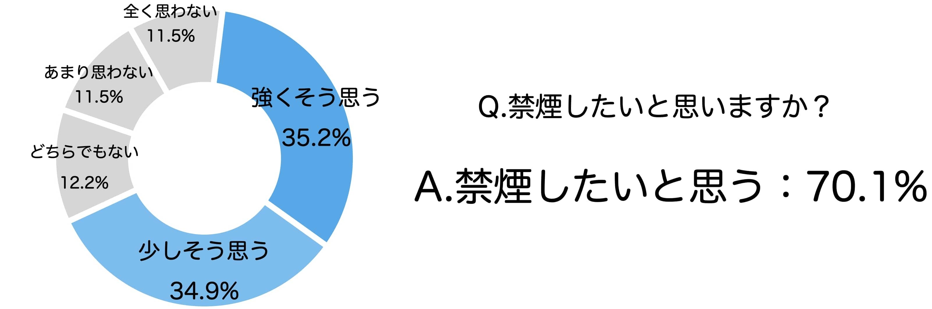 現在、強く禁煙したいと思っている方は35.2%、少しそう思う方は全体の34.9%となり、合計70.1%の方が禁煙したいと思っていることが分かりました。