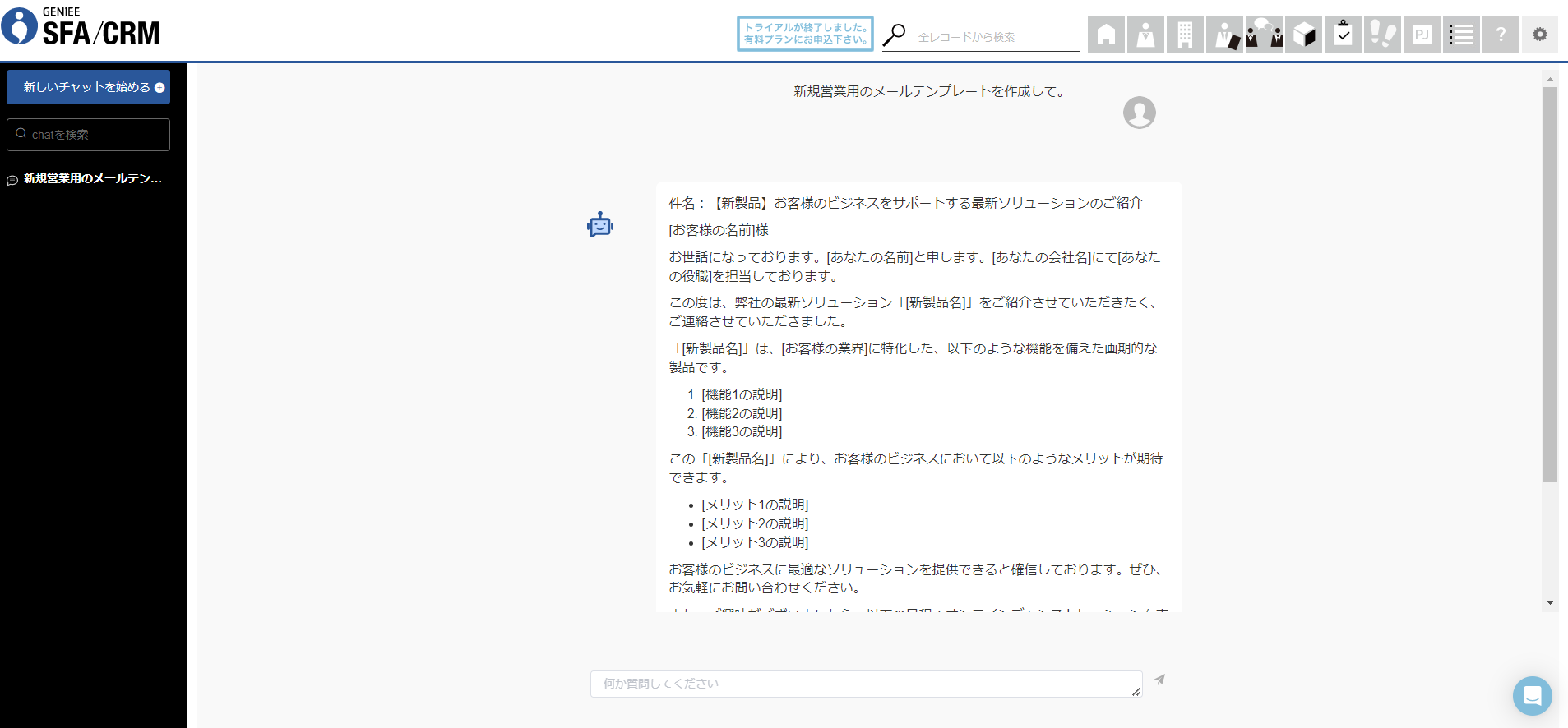 「AIアシスタント powered by GPT-4」は、「GENIEE SFA/CRM」の画面内で自然言語を用いてAIに指示を出すことで、手軽にAIを活用できるオプションプランです。
