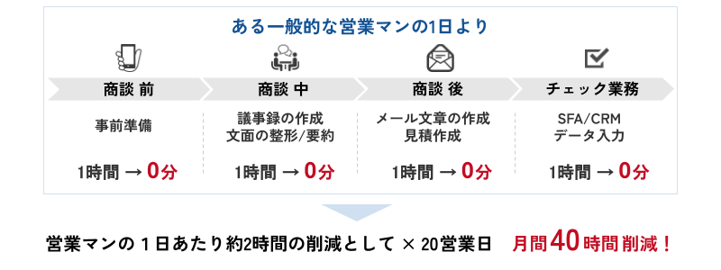 ④営業管理ツールへの情報入力:1→0時間(AIアシスタントに話しかけるだけで情報入力完了)
