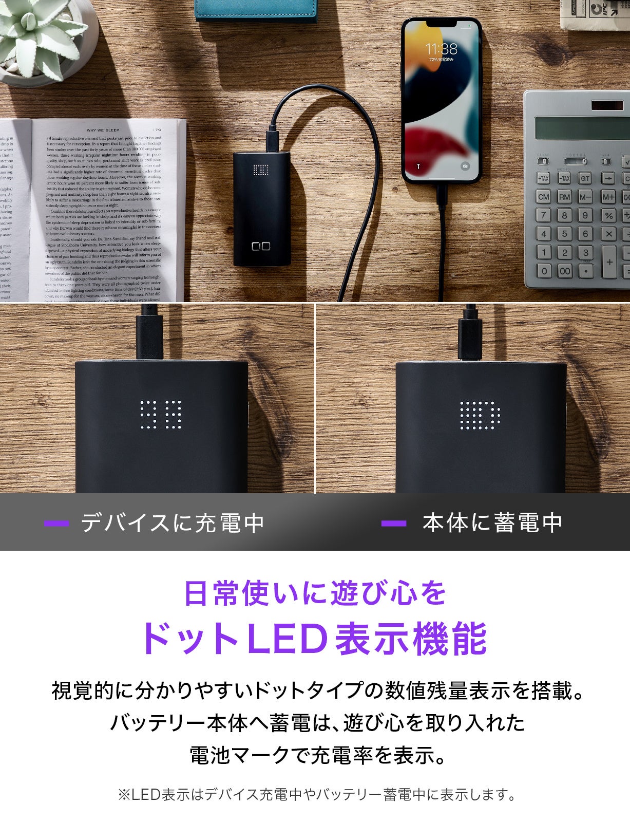 デバイスを充電中は残量を数値で表示し、本製品への蓄電中は遊び心を取り入れたアニメーション風にて残量を確認可能です。