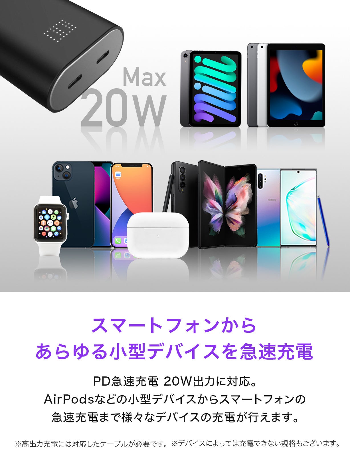 『SMARTCOBY DUO』は主流になりつつあるUSB Type-Cが2ポートを搭載、単ポート最大20W、2ポート合計40Wの高出力に対応しており、iPhone8以降であれば2台同時充電でも最大20Wのフルスピード充電が可能です。iPadやAndroidスマートフォンなど幅広く対応しています。