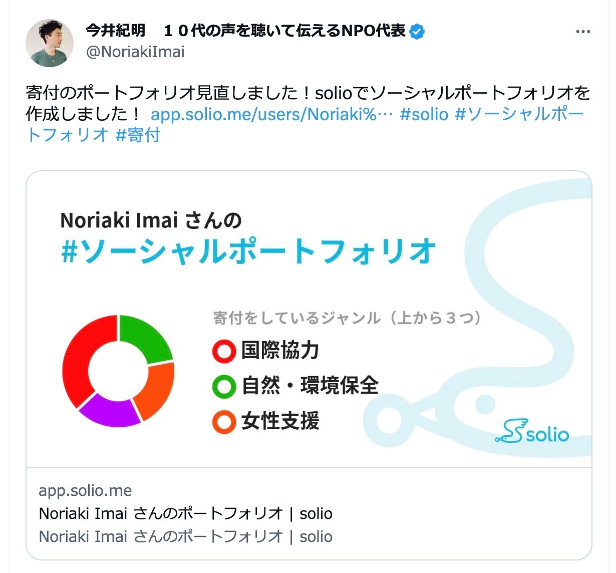 今回リリースされた「定期ツイート」は、solioの名前の由来でもある「ソーシャルポートフォリオ」の共有を促進するものです。この機能が広く使われることで寄付を気軽に伝えあえる社会が実現し、ひいては日本の寄付文化の拡大に貢献できればと思います。