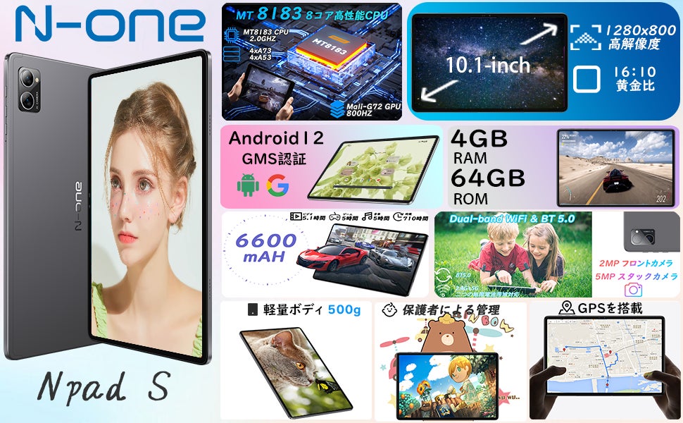 •  N-one NPad S タブレット、1200*800解像度 HD IPSディスプレイ、MTK 8183 8コアCPU 2.0GHz、1TB TF拡張可能+4GB RAM+64GB ROM、GMS認証+6600mAh大容量バッテリー+Type C充電+2.4G/5G Wi-Fi対応、 タブレット10.1インチ、Bluetooth5.0+GPS+2MP/5MPカメラ、日本語取扱説明書付き