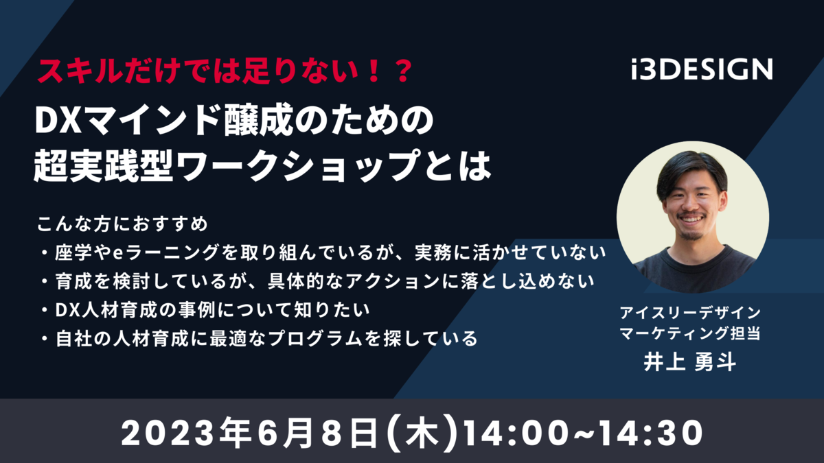 本説明会では、DX推進の現状と課題やDX人材に必要なスキルやマインドについて、またそれを実現する超実践型ワークショップ「ヒューマンイノベーションプログラム」をご紹介いたします。実際にご導入いただいているクライアント様の事例やアウトプットイメージもご紹介しますので、是非この機会にご参加ください。