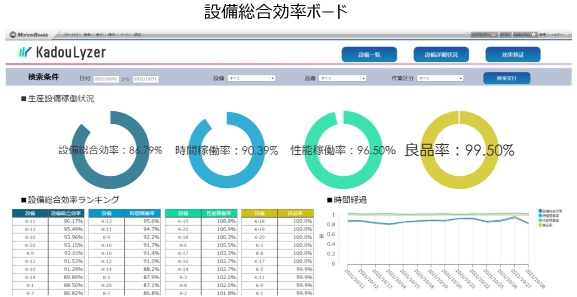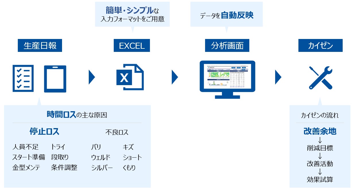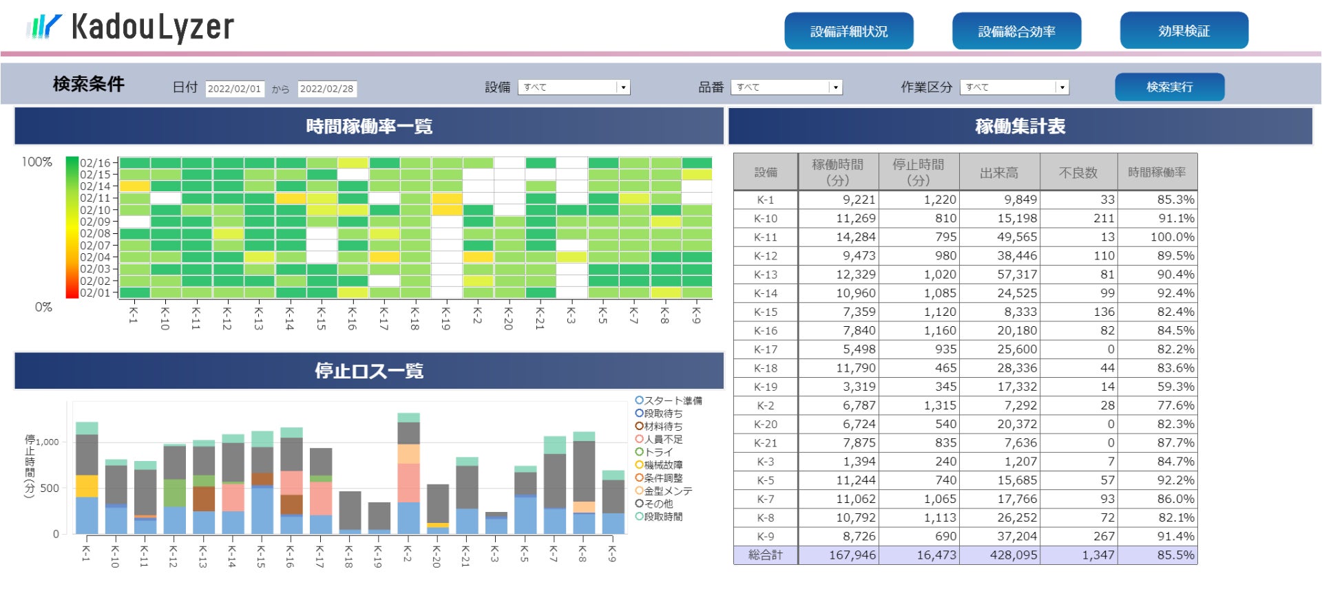 カドウライザーは生産日報に記載されている稼働時間、停止ロス、不良ロスを可視化、分析することでデータを