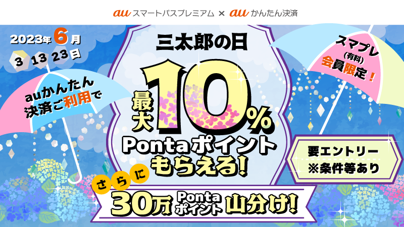 2023年5月に引き続き6月も、「三太郎の日」に「auかんたん決済」を利用すると、Pontaポイントがもらえるキャンペーン(※)を、 auスマートパスプレミアム会員限定で実施します。※ 一部のサービスは対象外となります。
