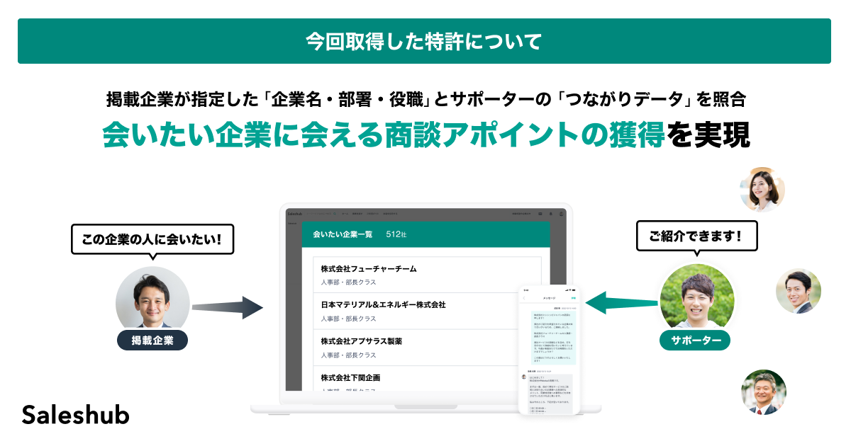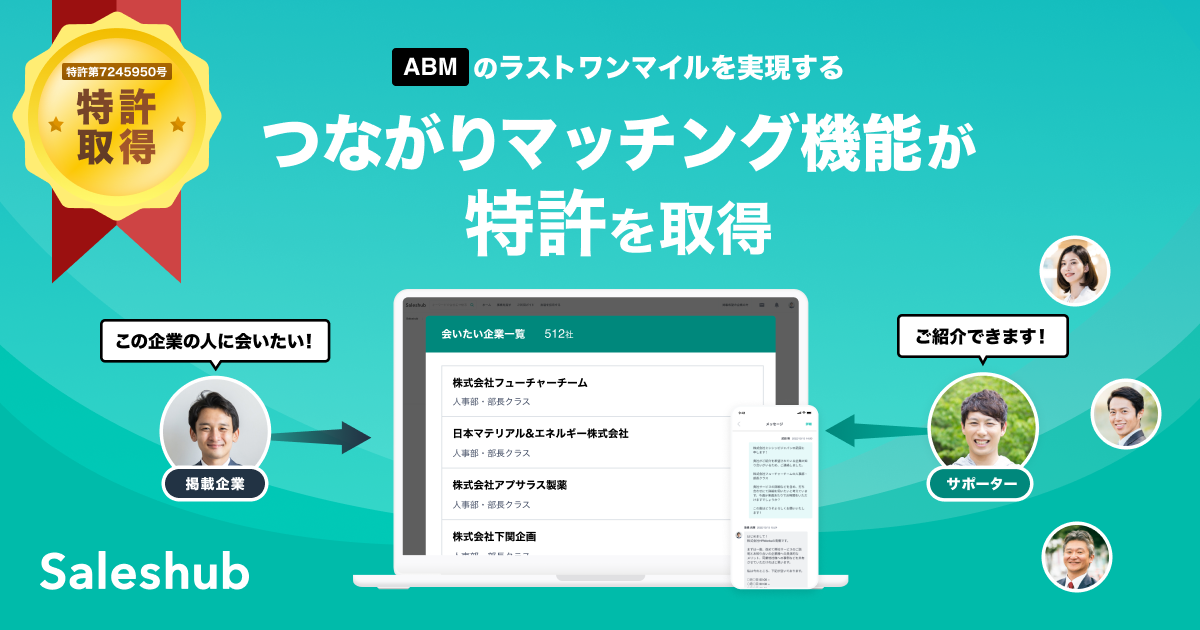 本件については「企業が希望する顧客候補のリスト」と「サポーターが登録したつながりデータ」の照合によって行われるマッチングシステムの独自性に特許が認められ、取得に至りました。これにより、これまでの営業の商習慣にはありつつも、その偶発性から営業手法の選択肢にはなり得なかった「顧客紹介」がSaleshubを介することで、再現性を持った「営業手法の一つ」として大きな価値を持つこととなり、アウトバウンド営業手法における新たなスタンダードとしてABM(=Account Based Marketing)*2のラストワンマイルを実現します。