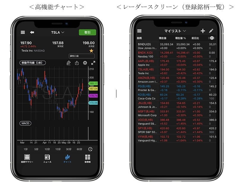「トレードステーション米国株 スマートフォン」で提供しているレーダースクリーンや高機能チャートといった各種機能は、米国株信用取引でも同様に利用可能です。また、レーダースクリーンで登録されている銘柄リストは米国株現物取引と米国株信用取引で共通のため、信用取引口座でも新たに銘柄を登録する必要はありません。