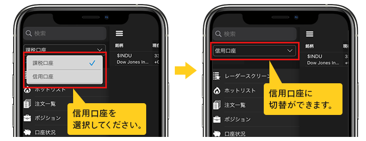 「トレードステーション米国株 スマートフォン」では、ログイン後、メニューバー左上にある口座表示で「信用口座」を選択することで米国株信用取引口座に切替わり、信用取引をご利用いただけます。
