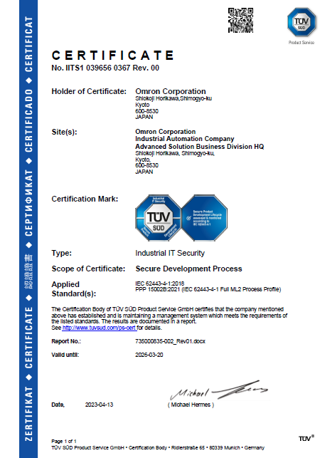 このたびテュフズードは、オムロン株式会社 アドバンスドソリューション事業本部に対し、IEC 62443-4-1認証を発行しました。IEC 62443-4-1の取得は、産業用オートメーション及び制御製品の開発ライフサイクルを通して想定されるセキュリティリスクに対し、多層の防御プロセス運用を実行している証明として非常に効果的です。認証を取得したプロダクトサプライヤーは、その開発プロセスにセキュリティ機能を組み込んだ組織として評価されます。またそのサプライヤが開発した制御機器は、IEC 62443シリーズのセキュリティを考慮した製品として認識されるため、組織、製品共に社会的信頼性の向上につながります。