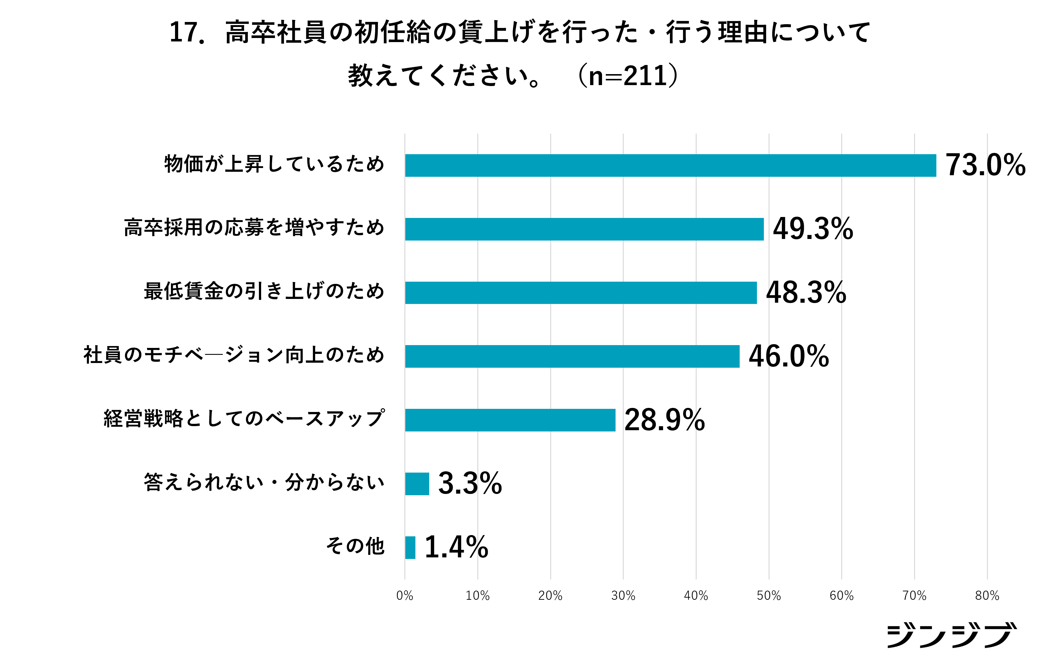 問15・16で賃上げを「行った」「行う予定がある」と回答した方に、賃上げを行う理由について質問したところ、「物価が上昇しているため」が73%となりました。次いで「高卒採用の応募を増やすため」が49.3%、「最低賃金の引き上げのため」が48.3%、「社員のモチベーション向上のため」が46%、「経営戦略としてのベースアップ」28.9%でした。