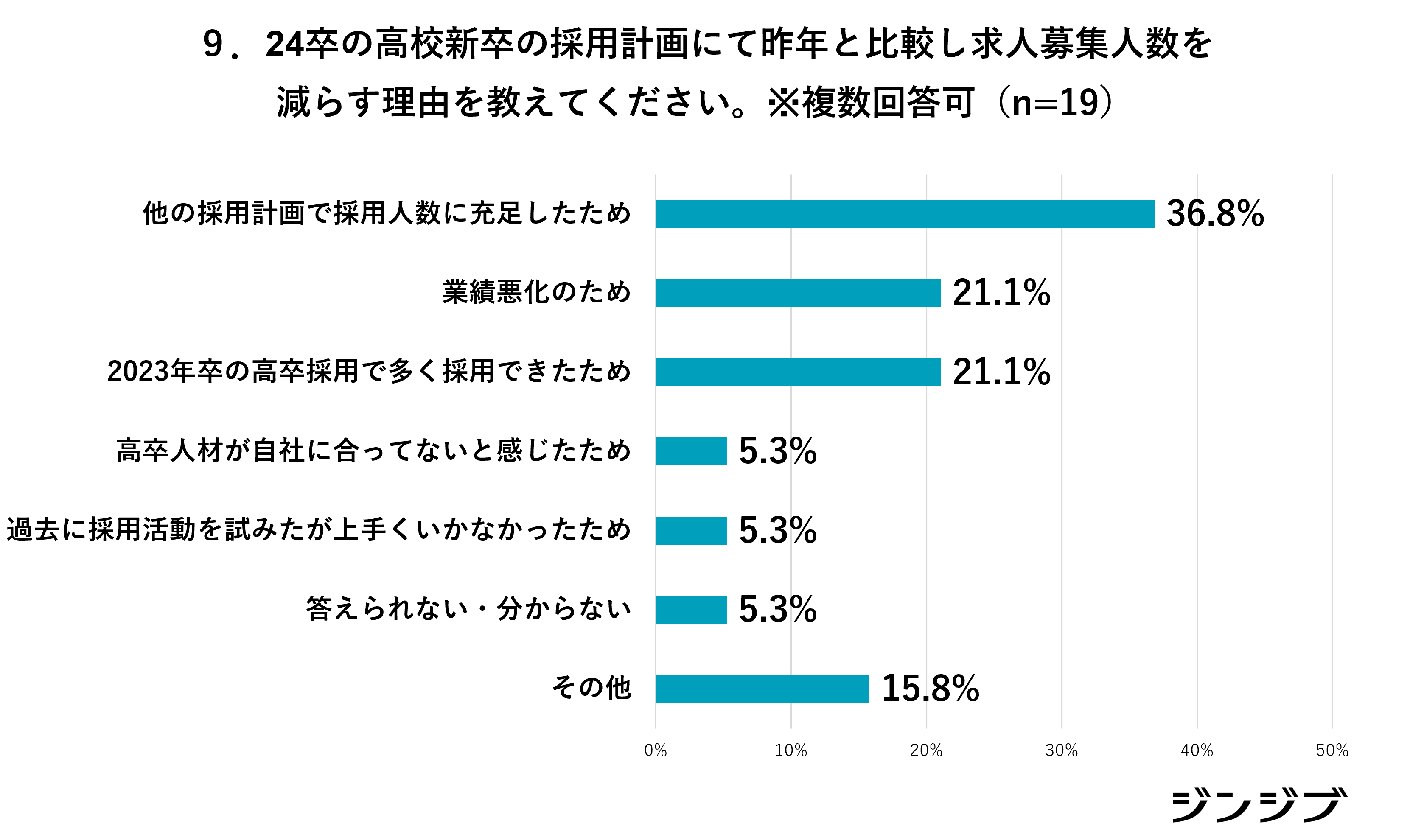 問7で「減らす」と回答した方に理由を質問したところ、「他の採用計画で採用人数に充足したため」が36.8%、「業績悪化のため」「2023卒の高卒採用で多く採用できたため」が21.1%、「高卒人材が自社に合っていないと感じたため」「過去に採用活動を試みたが上手くいかなかったため」が5.3%でした。