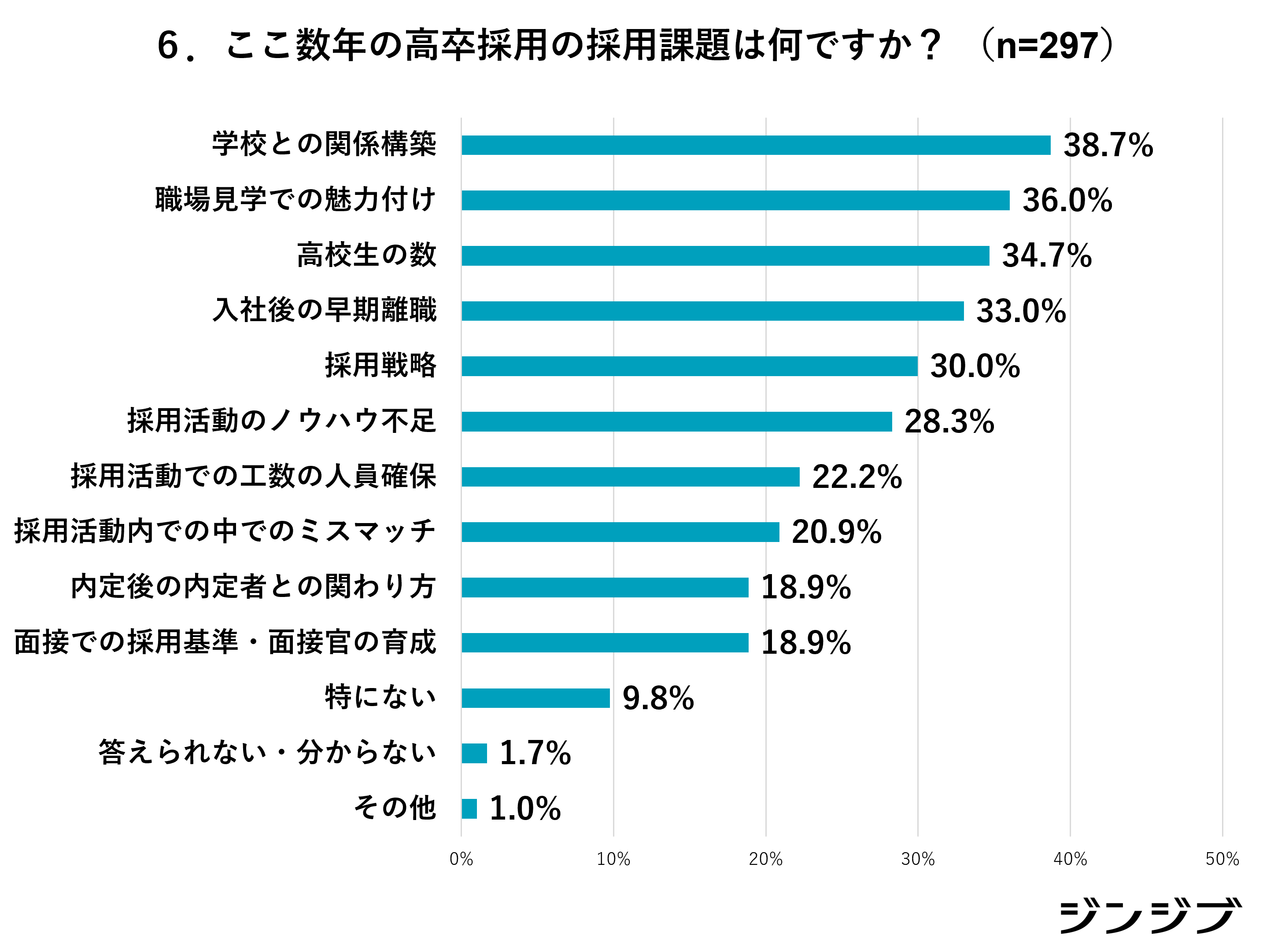 高卒採用を行っていると回答した方に、高卒採用課題について質問したところ、最も多い回答が「学校との関係構築」38.7%でした。続いて、「職場見学での魅力付け」36%、「高校生の数」34.7%、「入社後の早期離職」33%でした。