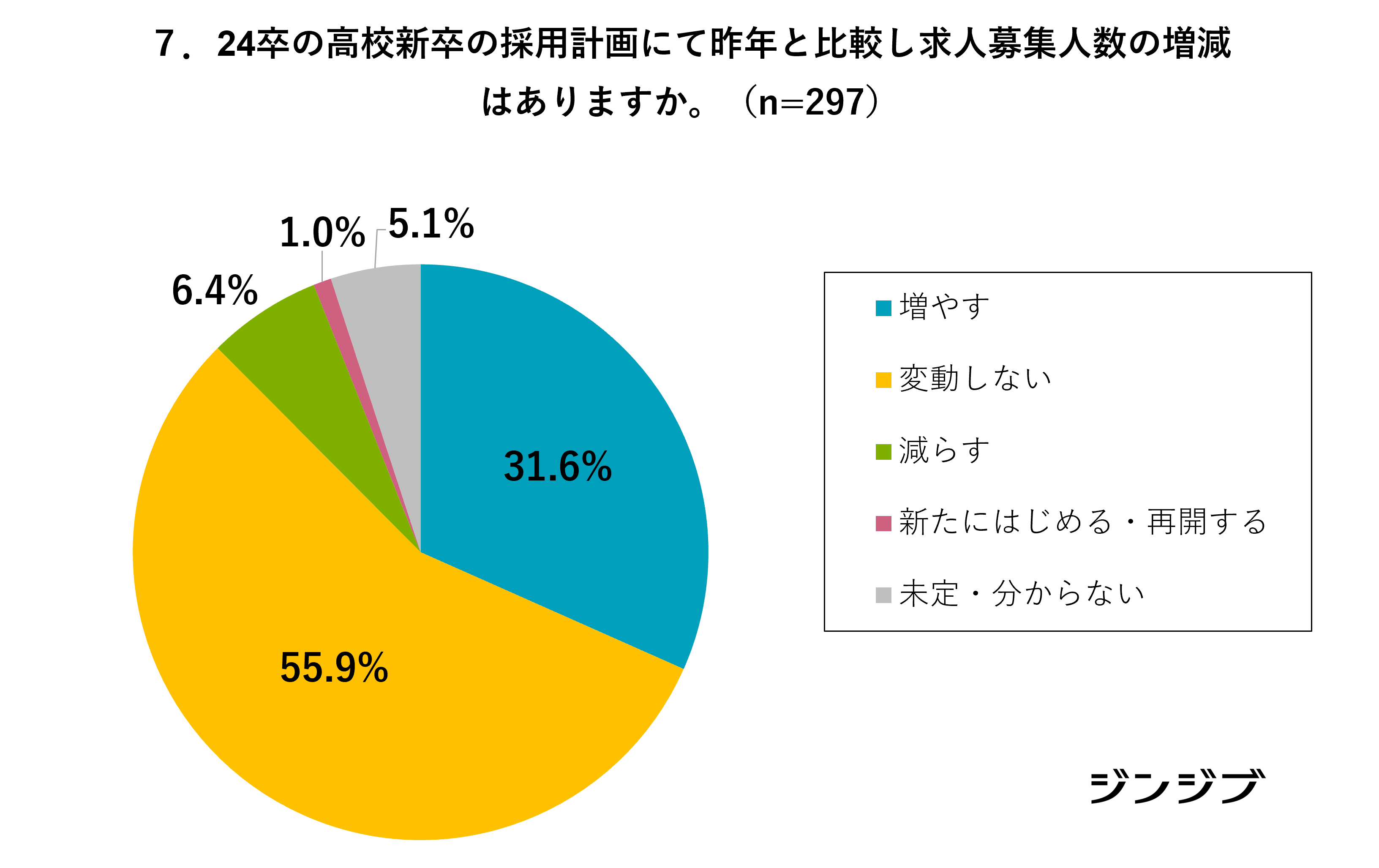 7.24卒の高校新卒の採用計画にて昨年と比較し求人募集人数の増減はありますか。(n=297)