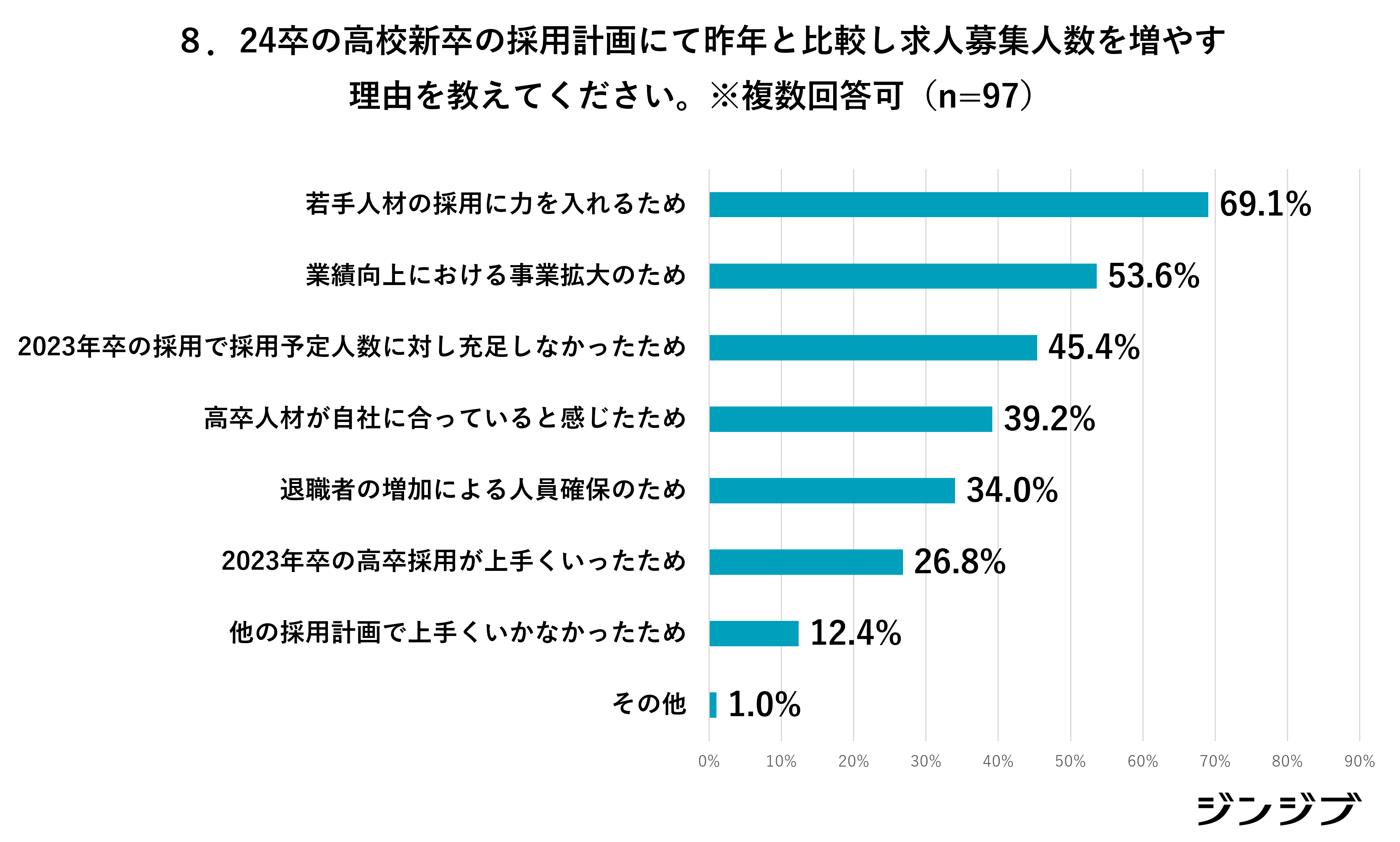 8.24卒の高校新卒の採用計画にて昨年と比較し求人募集人数を増やす理由を教えてください。※複数回答可(n=97)