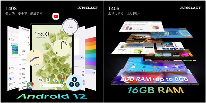 「T40S」は新しいAndroid 12インテリジェントオペレーティングシステムは、新しいユーザーインターフェースデザインにより使いやすい操作体験を提供します。また、デスクトップからアプリを起動することができ、より優れた権限管理が可能で、ペアレンタルモードも搭載されています。「T40S」は2.4G+5GデュアルバンドWi-Fi、Bluetooth 5.0に加え、GPS、GLONASS、Galileoにも対応し、より正確なナビゲーションを提供します。