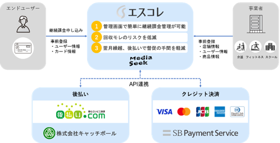 メディアシークは業界NO.1の拠点数を誇るスクール管理システム「マイクラス」を運営していく中で、顧客から寄せられた、継続課金に対応し、且つ回収が確実な決済システムが欲しいという要望に応えるべく、SBPSおよびキャッチボールと協業し、継続課金が可能なクレジット決済サービスとして「エスコレ」の提供を開始しました。今後、「エスコレ」は後払い機能にも対応予定です。