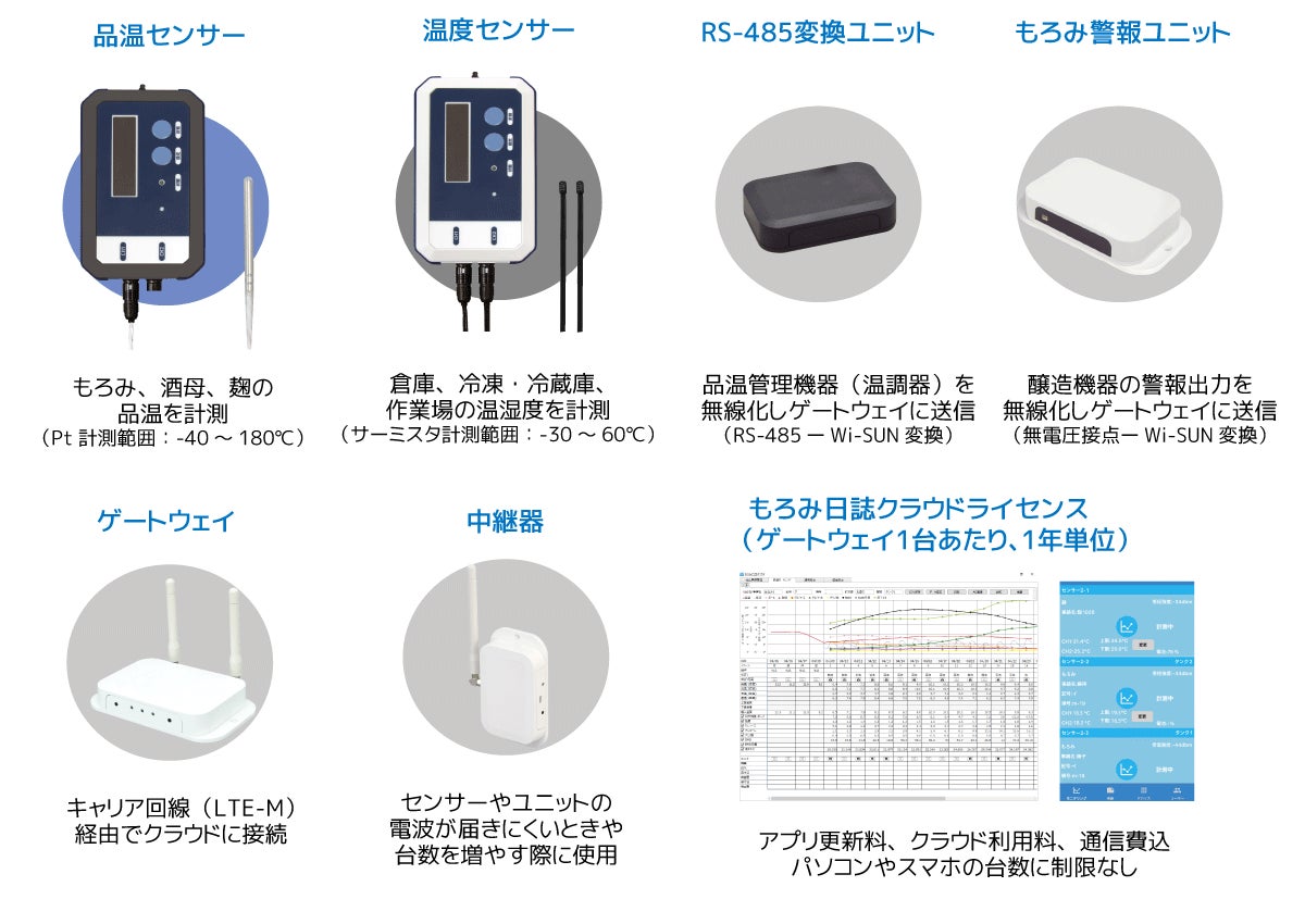 使用する無線システムとアプリは従来と共通で、新たに追加が必要なのは温度センサーのみ。ライセンスも共通で、本機能追加によるオプション費用などは発生しません(※)。もろみ日誌クラウドの導入環境では、酒造り現場全体の温度管理DXを低コストでおこなうことが可能になりました。
