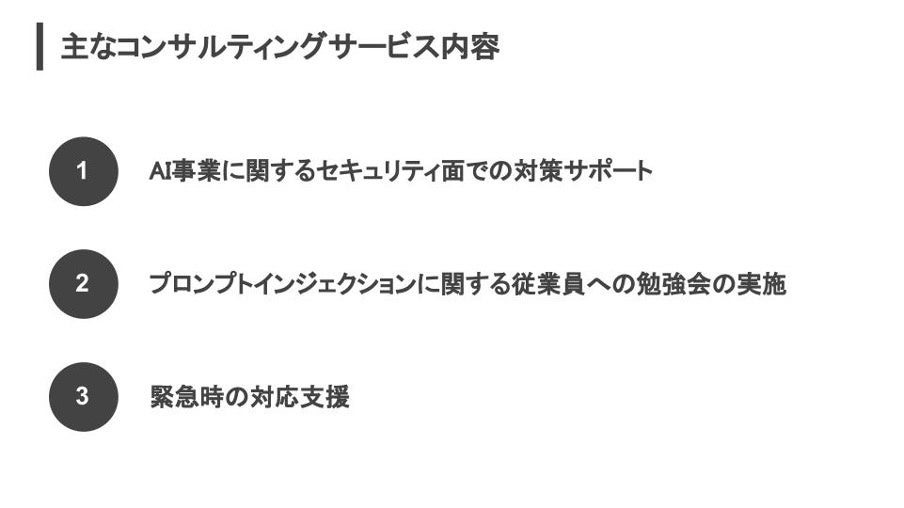 株式会社WANDのプロンプトインジェクション対策コンサルティングサービスでは、プロンプトインジェクションに精通するエンジニアがクライアント企業を訪問し、AI事業に関するセキュリティ面での対策提言、従業員教育とトレーニング、緊急時の対応支援などを提供します。クライアントの個別のニーズに合わせた、カスタマイズされたソリューションを提供し、セキュリティインシデントの発生を最小限に抑えます。