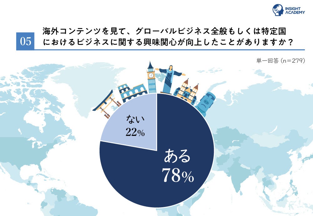 本調査結果によると、「海外コンテンツに興味がある」と回答した若手社員のうち、約78%が海外コンテンツを視聴することで、グローバルビジネス全般もしくは特定の国におけるビジネスに関する興味関心が向上したと回答しました。