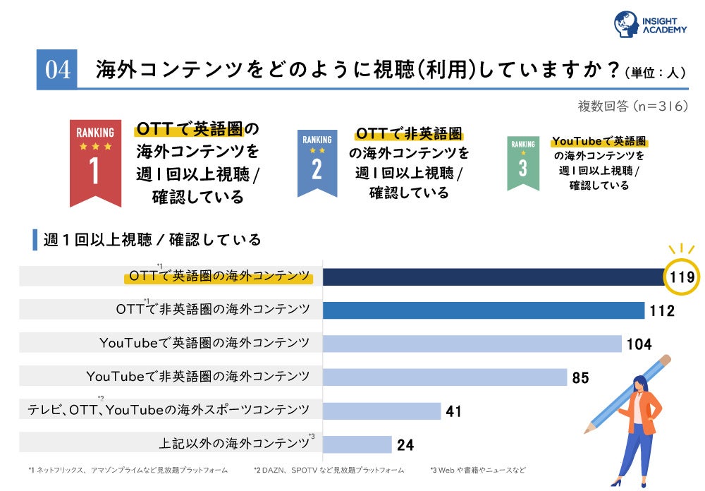 さらに、インターネット上のOTTプラットフォームやYouTubeの普及により、海外のコンテンツを手軽に視聴することができるため、若手社員の興味を引きやすくなっていると言えます。また、SNSを通じて海外の有名人や知人をフォローすることで、若手社員は世界中のトレンドや文化にアクセスし、海外コンテンツに触れる機会を増やしています。