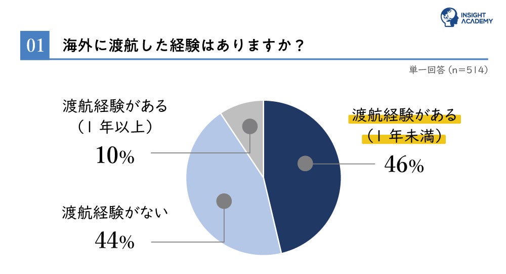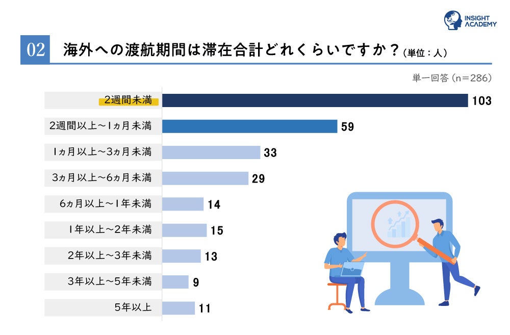 一方、海外への渡航経験者の多くが短期間の滞在であり、長期間の渡航経験がある社員は比較的少ない傾向にあります。また、渡航経験がない若手社員は約44%でした。若手社員の多くが海外に短期間滞在する機会を持っている一方、長期間の滞在経験が少ないことが推測されます。