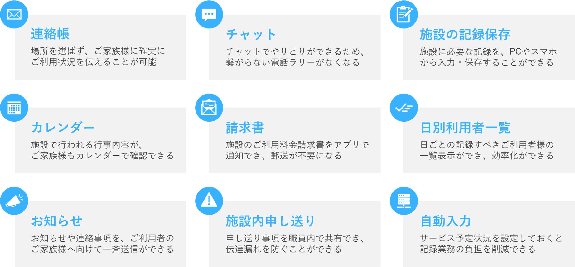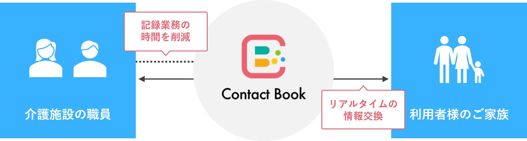 施設利用者のご家族様とのリアルタイムでのコミュニケーションを実現する「連絡帳アプリ」です