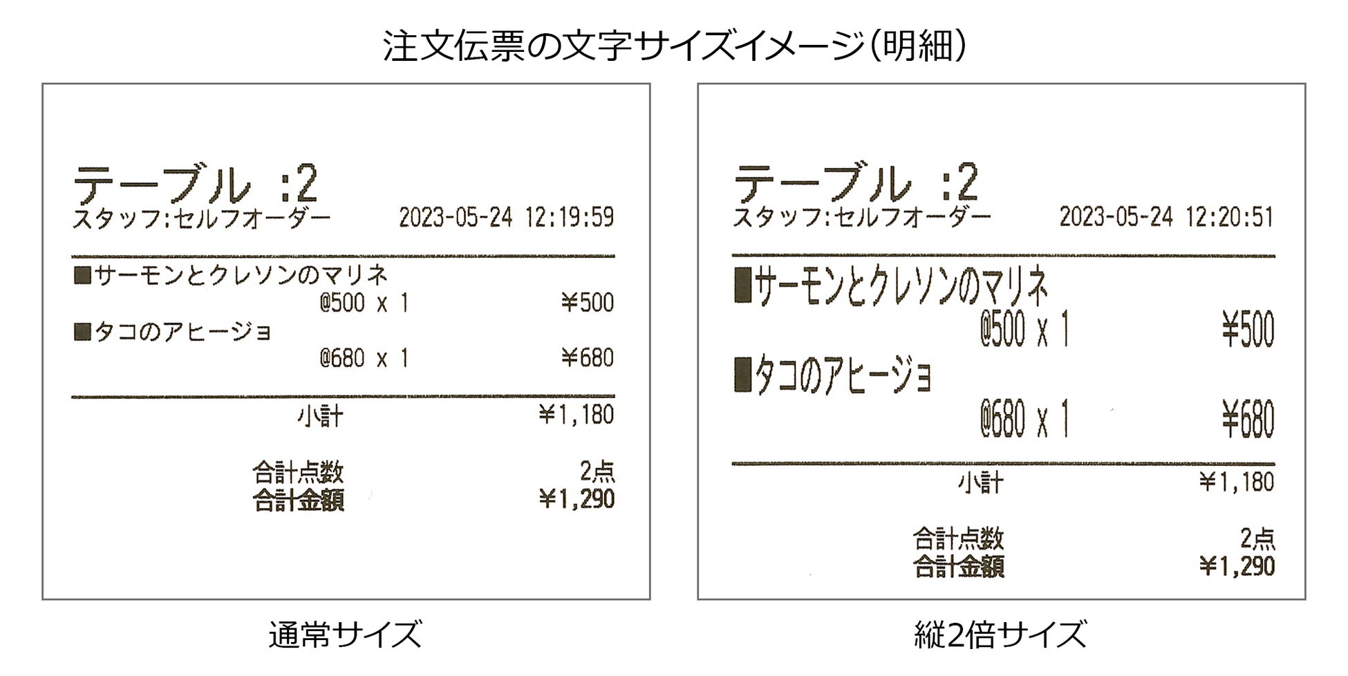注文時に印刷される「注文伝票」について、文字を大きくして欲しいと多くのご要望をいただいておりましたので、本アップデートにより以下の項目を選択できるようになりました。