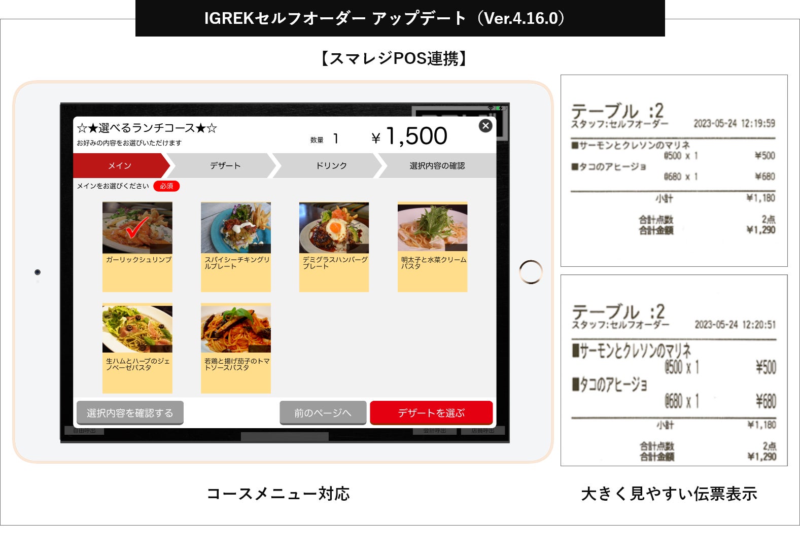 株式会社イグレック(大阪市西区、代表取締役:新田 秀幸、以下 イグレック)は、セルフオーダーシステム「IGREKセルフオーダー」へ、スマレジPOS連携での「コースメニュー対応」、「大きく見やすい伝票表示」を搭載するアップデート(Ver.4.16.0)を実施いたしました。