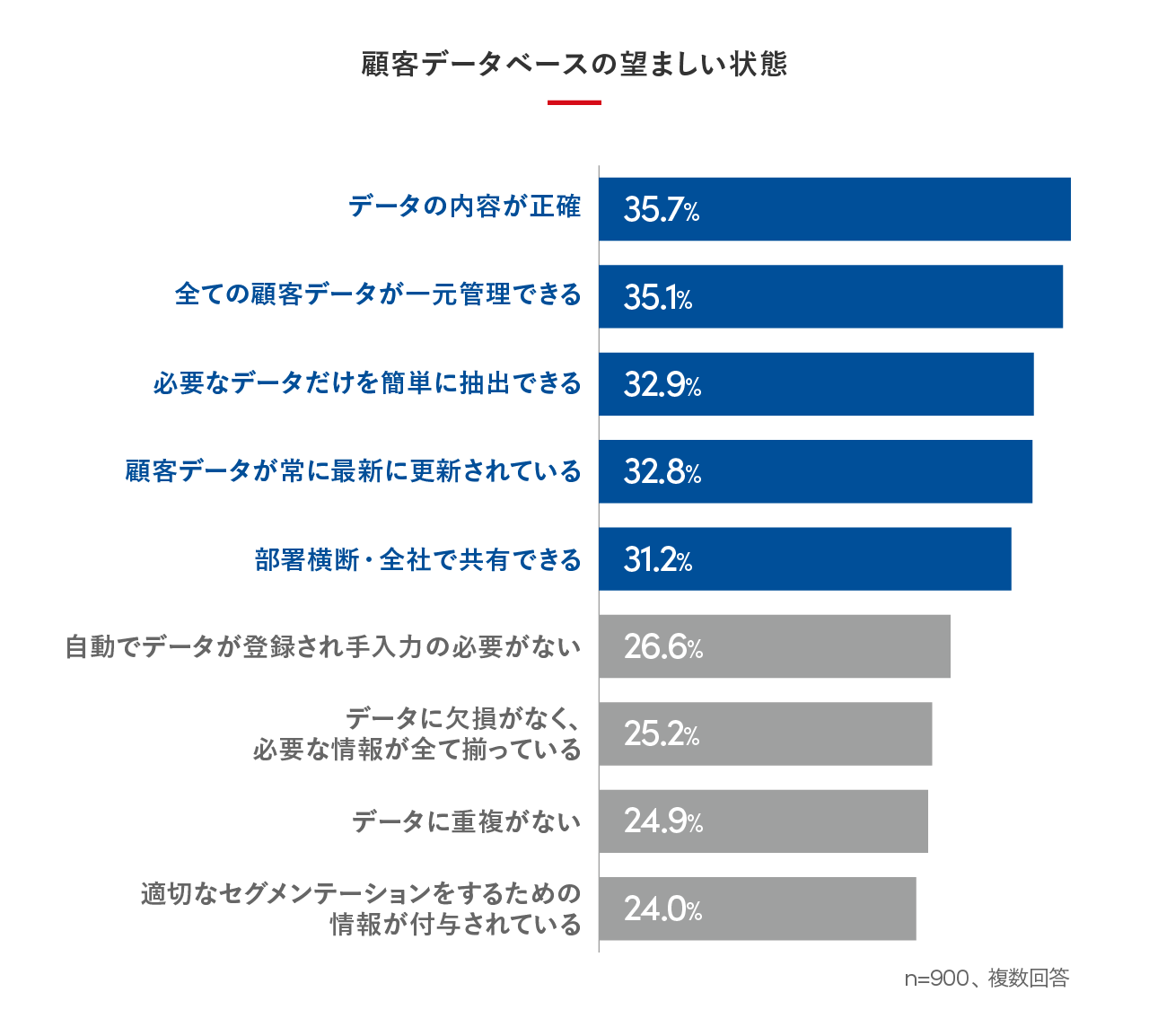 顧客データベースがどのような状態であることが望ましいかをたずねたところ、第1位「データの内容が正確」(35.7%)、第2位「全てのデータが一元管理できる」(35.1%)、第3位「必要なデータを簡単に抽出できる」(32.9%)、第4位「データが常に最新に更新されている」(32.8%)、第5位「部署横断・全社で共有できる」(31.2%)が上位となりました。