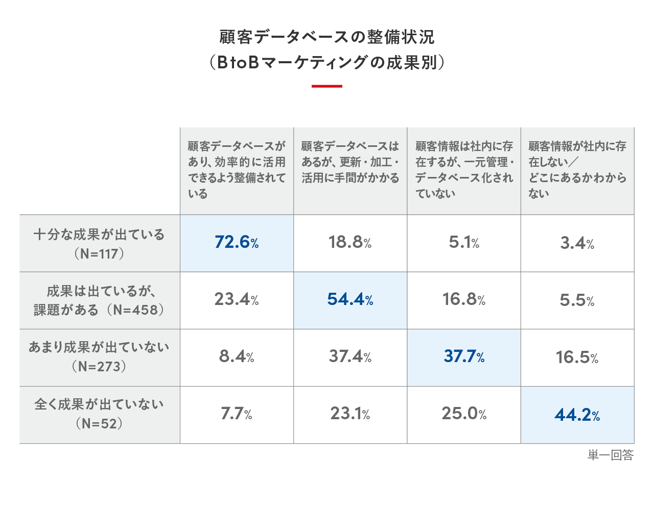 BtoBマーケティングに重要な「顧客データベース」の整備ができている企業は全体のわずか24.3%。成果が出ている企業ほど顧客データベースの整備、活用が進んでいる