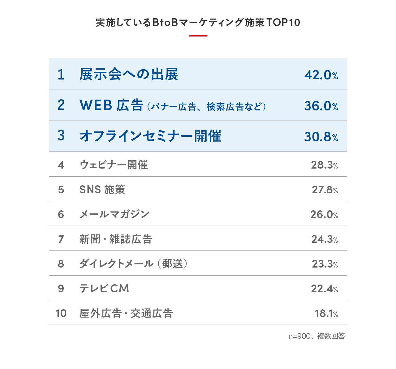 BtoBマーケティングの主な施策は「展示会への出展」「WEB広告」「オフラインセミナー開催」