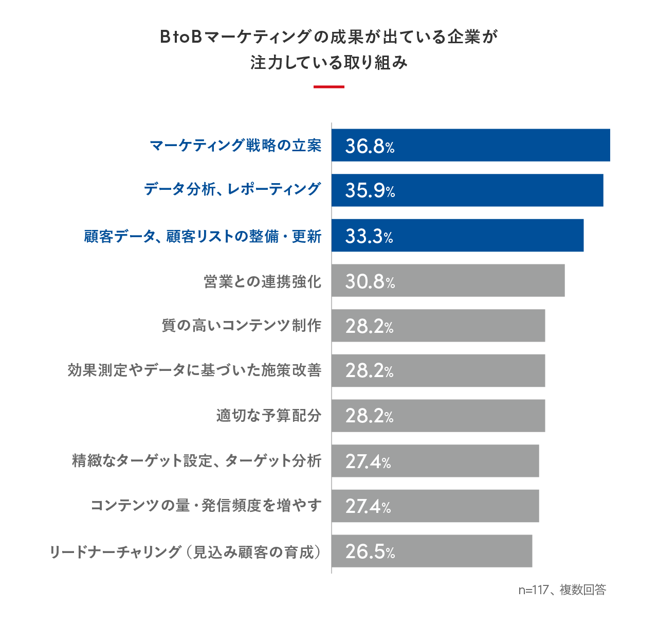 BtoBマーケティングの成果が十分に出ている企業が注力している取り組みの上位は「マーケティング戦略の立案」「データ分析、レポーティング」「顧客データ、顧客リストの整備・更新」